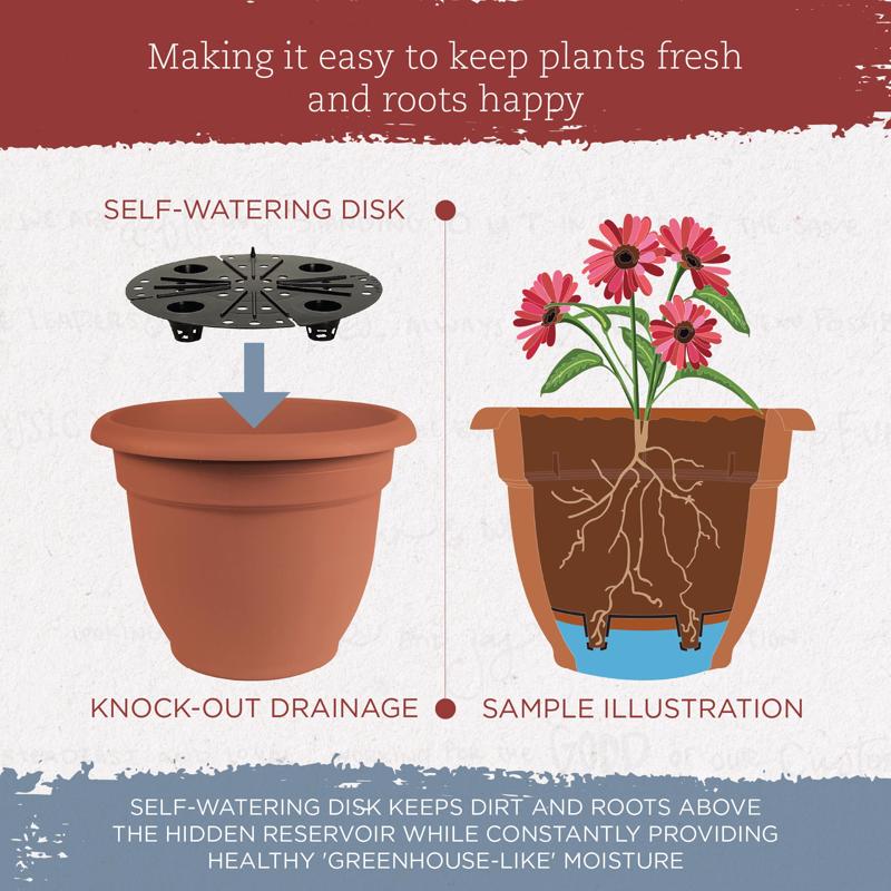 The Bloem Ariana Planter is designed with a self-watering disk, which is an internal drainage reservoir that helps prevent damaging root rot and allows oxygen to easily access plant roots. An ideal alternative to clay or ceramic pots. 100% recyclable.