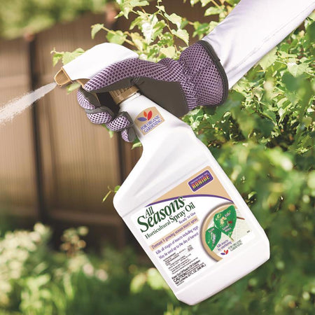 Bonide All Seasons Horticulture Spray Oil RTU is formulated for Organic Gardening. A superior type paraffinic oil that may be used as a growing season spray, dormant spray (no leaves) or delayed dormant (green tip) spray to control overwintering eggs of red spiders, scale insects, aphids, bud moths, leaf roller, red bug, codling moth, blister mites, galls, whitefly, mealy bugs and other insects and diseases. Highly recommended for use on fruit trees, shade trees, shrubs, ornamentals, roses and vegetables. Safe and pleasant to use.
