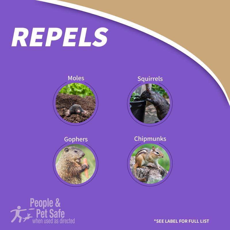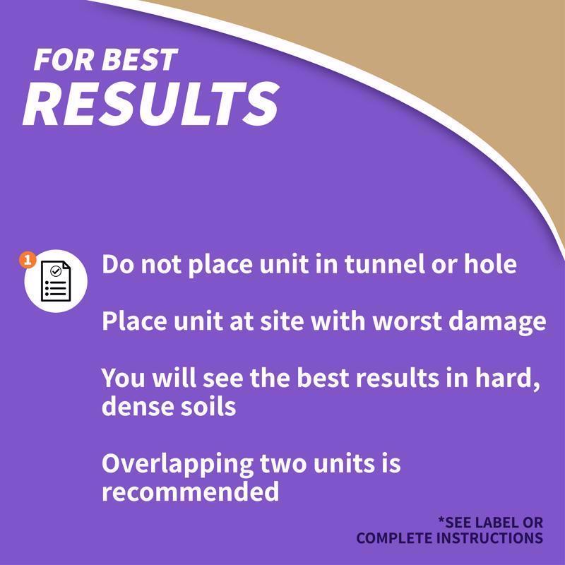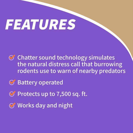 Bonide's MoleMax Animal Repellent Stake 61120 mimics the predatory warning sounds of moles, gophers, ground dwelling squirrels and chipmunks with scientifically developed sonic spike technology. It provides an eco-friendly pest control option, protecting up to 7,500 square feet of your yard or garden with no harmful chemicals required. Safe for use around children and pets also.
