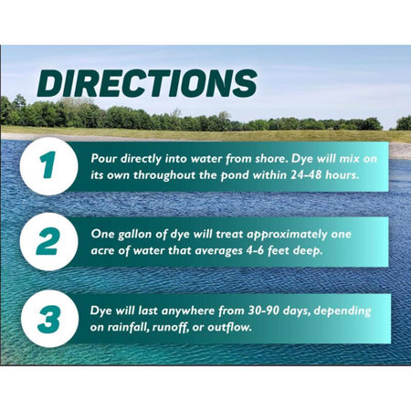 Crystal Blue Ocean Blue Lake & Pond Colorant uses a proprietary formula to give to your lake or pond a beautiful turquoise blue color all year long. 100% safe for humans, fish, livestock, pets, birds, swimming, potable water and irrigation. Maintains color and clarity for up to 30 days. Helps settle out dissolved solids. 1 gallon treats 1 surface acre, 4 to feet deep.