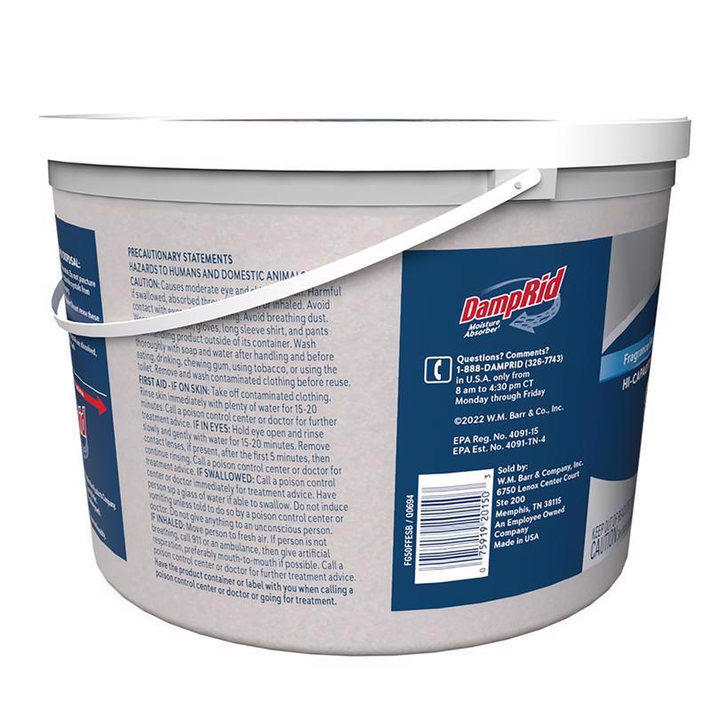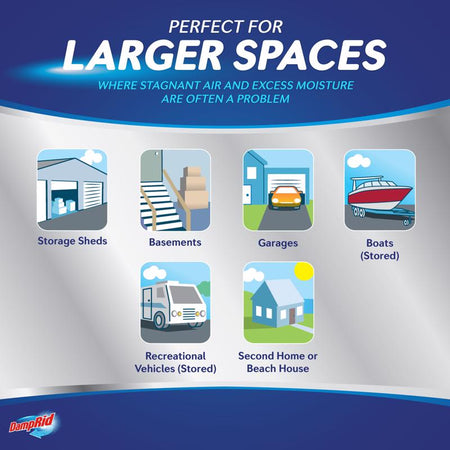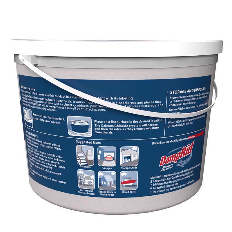 The DampRid Hi-Capacity Moisture Absorber Bucket effectively removes excess moisture from the air to eliminate stale and musty odors. Using Microban technology, it also prevents the growth of mold and mildew*. Its high capacity design is suitable for large spaces, making it an excellent choice for eliminating odors in garages and basements. It is also ideal for crawl spaces, storage areas, and stored RVs & boats.