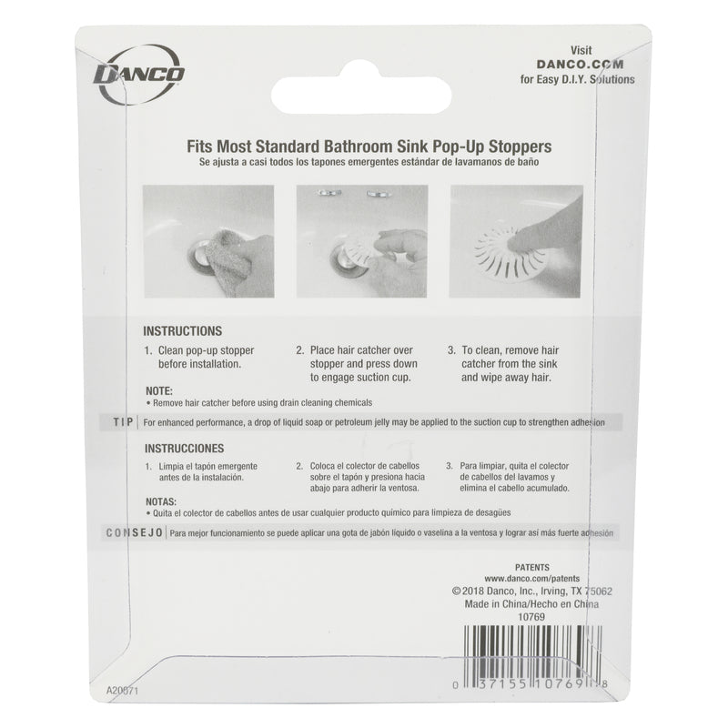 • Capture hair and prevent clogged drains with Danco’s unique silicone bathroom sink hair catcher. The patent pending suction cup design clings to the stopper, keeping the hair catchers in place when the stopper is open or closed.