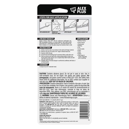 DAP 00956 Alex Plus Acrylic Latex Caulk with Silicone is a premium sealant designed for both interior and exterior applications. Its acrylic latex base combined with silicone ensures exceptional flexibility, adhesion, and a waterproof seal that resists shrinking and cracking.