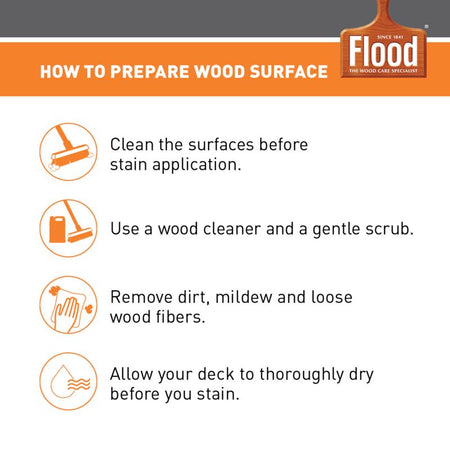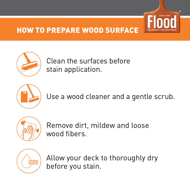 • Weathered, uncoated surfaces: clean with Flood WOOD CLEANER prior to coating.
