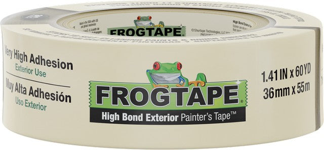 FrogTape Beige High Bond Exterior Painter's Tape 105419 is a specialty-grade tape designed for superior adhesion on challenging exterior surfaces, including self-cleaning paints, wood, vinyl, aluminum, steel, brick, and concrete. It ensures clean removal for up to three days without shredding or leaving residue, making it ideal for precise masking and securing protective coverings during painting.