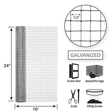 Garden Zone Hardware Cloth is available with mesh openings including 1/8-inch, 1/4-inch, and 1/2-inch. Roll widths include 24-inch, 30-inch, 36-inch, and 48in. Roll lengths include 5-foot, 10-foot, 25-foot, 50-foot, and 100-foot. All products are galvanized after welding. Product uses include soil sifting screens, security screens, rodent screens and pet cages.