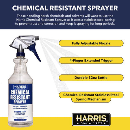 The Harris Chemical Resistant Sprayer is a heavy-duty plastic bottle and trigger sprayer used by professionals to spray a wide variety of liquid products including bleach, alkaline and acidic based products. Highly recommended for use in commercial, industrial and residential, with cleaners, bug killers, degreasers, weed killers and many other uses. It features an adjustable nozzle for a fine mist or stream. Includes measurement scale on the bottle for your convenience.