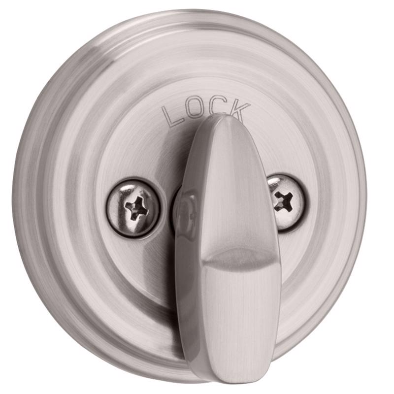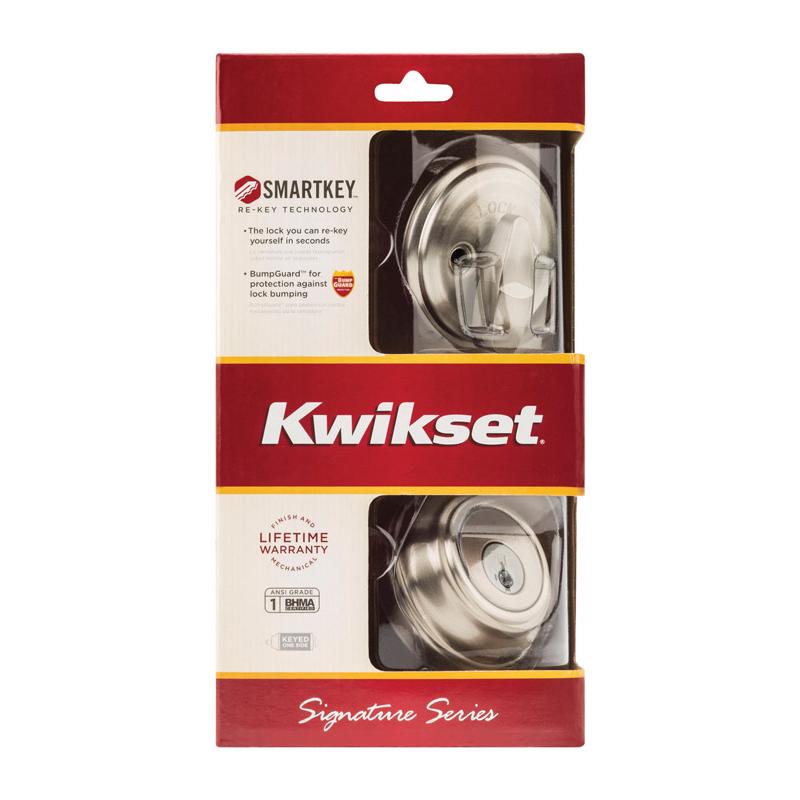 Step up to designer styles and superior security with Kwikset Signature Series products. The 980 deadbolt series is both tough and attractive. This single cylinder deadbolt can be locked or unlocked by a key on the outside, or the turn piece on the inside. The crisp, clean appearance of the Satin Nickel finish adds to the overall look of the product and brings a modern feel.