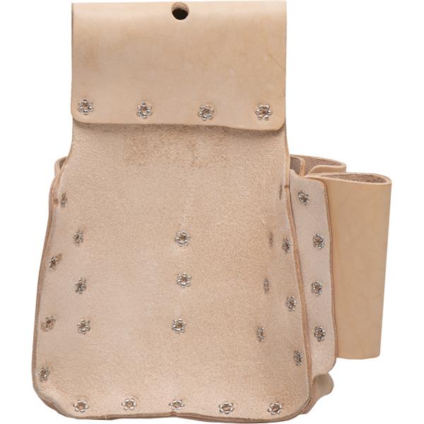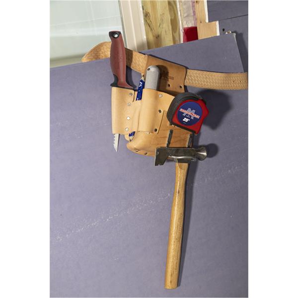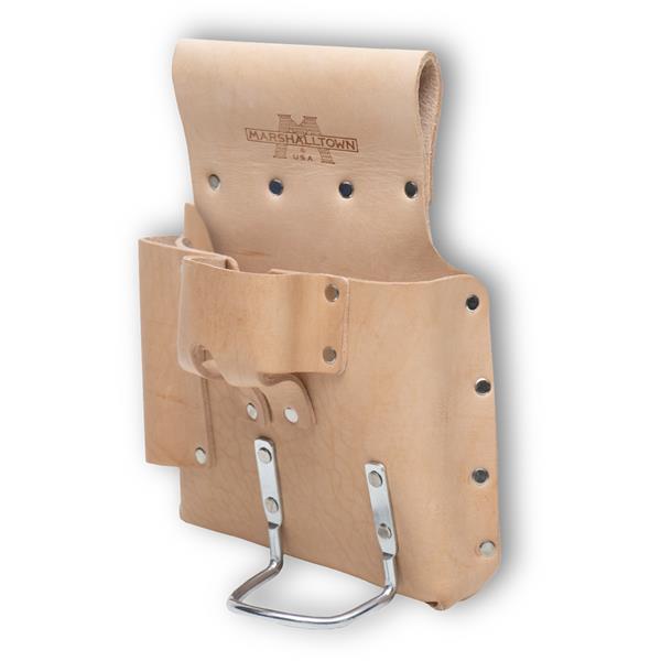 The Marshalltown Drywall Pouch is made of heavy top grain saddle leather. Features a "U" loop hammer holder, rule pocket and wid tunnel belt loop. Pouch is riveted at all stress points. Gusseted sides give shape.