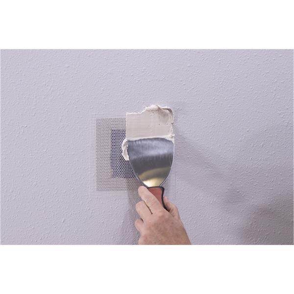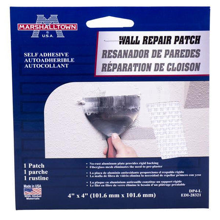 The Marshalltown Wall Repair Patch Kit is a self-adhesive patch with a no-rust aluminum plate that provides a rigid backing. The fiberglass mesh eliminates the need to pre-plaster.