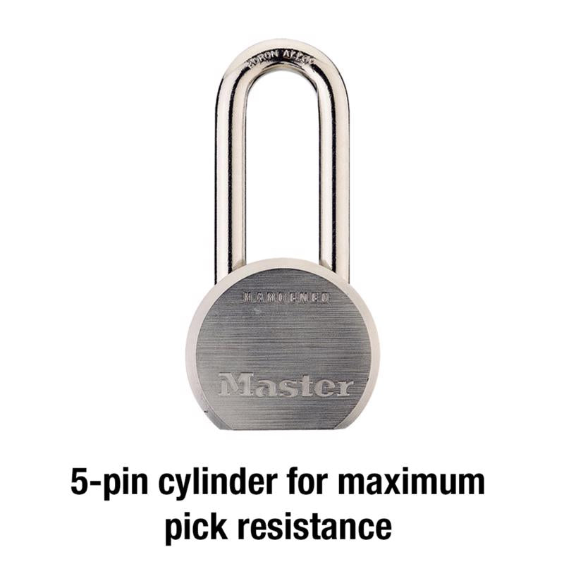 The Master Lock No. 930DLHPF Solid Body Padlock features a 2-1/2in (64mm) wide solid steel lock body that is strong, durable and resists corrosion. The 7/16in (11mm) diameter shackle is 2in (51mm) long and made of hardened boron alloy, offering maximum resistance to cutting and sawing. The 5-pin cylinder prevents picking and can be removed to rekey the lock. The Limited Lifetime Warranty provides peace of mind from a brand you can trust.