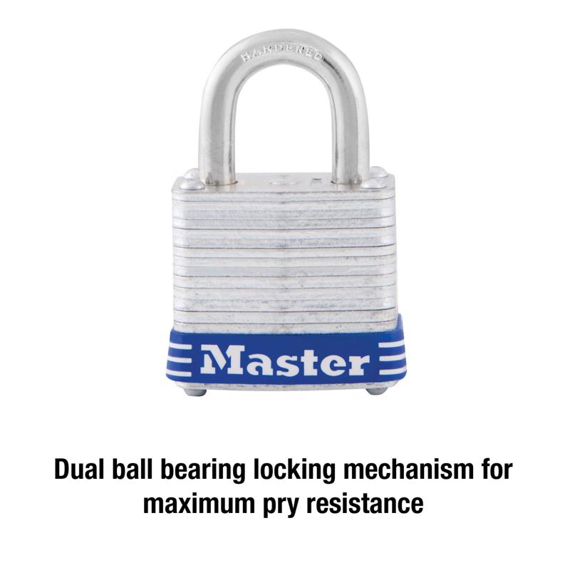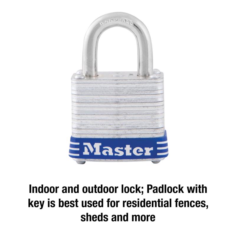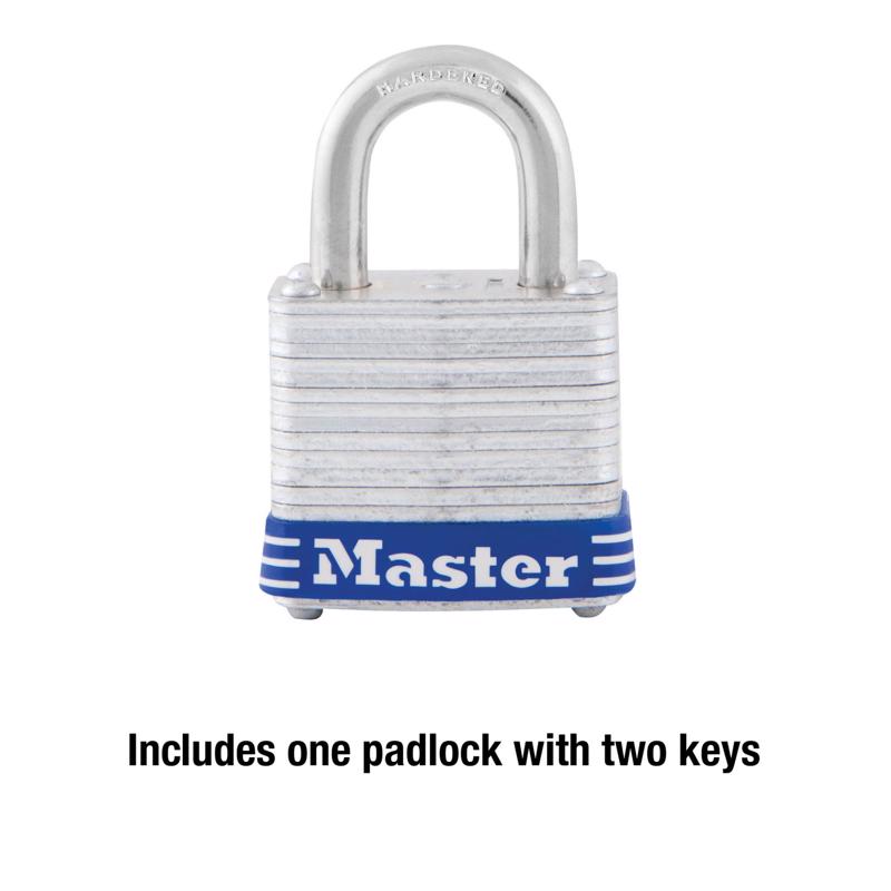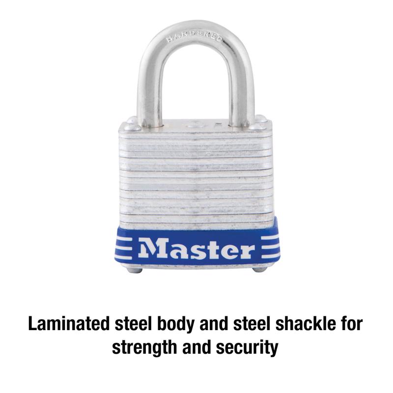 The Master Lock Laminated Steel Padlock features a laminated steel body for superior strength. Steel shackle. Dual locking levers provide extra pry resistance. 4-pin cylinder helps prevent picking.