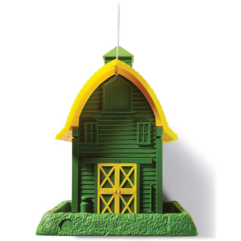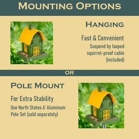 The North States 9096 Green Barn Bird Feeder is part of an extensive Village Collection and is made from durable molded plastic, perfect for years of outdoor use. Its green sides with yellow accents and a yellow roof give it an inviting aesthetic, and the clear plastic pane windows provide an easy way to monitor seed levels. The roof contains a lift-off cupola for easy filling and the large tray/perch is removable for easy clean out. This versatile feeder can be used for either hanging or pole mounted.