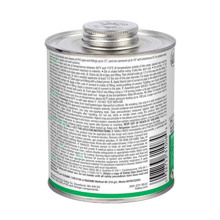 Thick formula fills gaps in large diameter pipe and loose fitting joints. Meets ASTM D2564. Recommended for potable water, pressure pipe, conduit and DWV.