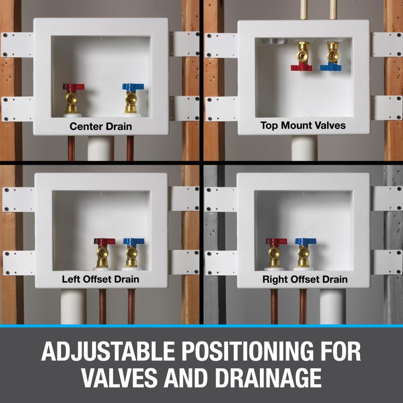 The Oatey Quadtro 1/4 Turn Copper Washing Machine Outlet Box is available for commercial and residential applications that require supply valves and waste drain recessed into the wall. 2-inch drain opening fits PVC or ABS Sch. 40 DWV pipe. Easy to remove knockout, Patent Pending Hammer Valves. Snap-on Faceplate Frame accommodates up to 1 inch drywall. Box made of high impact polystyrene. Top or Bottom Valve Mount. 4 support brackets included for mounting. Box Dimensions: 8-3/4W x 7-1/2H x 3-5/8D