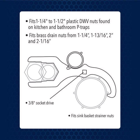 Superior Tool's SinkDrain Wrench is a must-have for sink and bathroom plumbing projects due to its exceptional versatility and innovative design. Only available from Superior Tool, this patented wrench features a universal design that fits various sizes of kitchen and bathroom P-trap nuts, kitchen sink basket strainer nuts, and plastic nuts with wing tabs. Additionally, its stepped head design can accommodate a variety of brass drain nuts, while the 3/8 inch square socket drive recess provides extra leverage for tougher jobs.