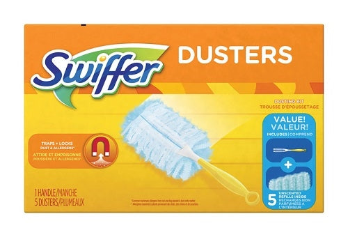 Swiffer Dusters use thousands of fluffy fibers with Dust Lock Adhesive that traps and locks 2X more dust than a feather duster on virtually any surface for a great clean. Includes one handle and five duster refills.