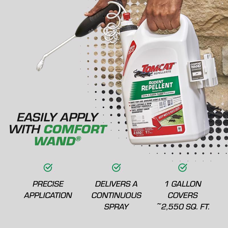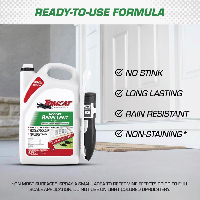 Tomcat ® Repellents Rodent Repellent Ready-to-Use is an advanced liquid formula designed to effectively deter mice and rats from entering homes. The no-stink formula is long lasting and rain resistant, tested and proven to prevent rodent entry, nesting and foraging.