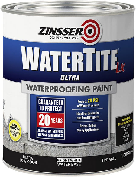 Protect your home from water damage with Rust-Oleum® Zinsser® WATERTITE®-LX Waterproofing Paint. This latex-based formula resists up to 20 PSI of water pressure and prevents mold and mildew growth. Its low odor and easy application make it perfect for basements and other interior/exterior surfaces. Backed by two manufacturer guarantees for up to 15 years.