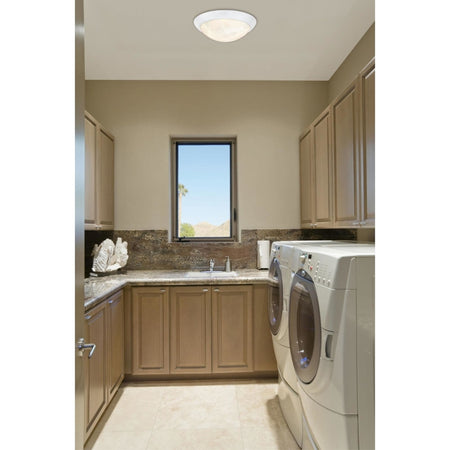This traditional flush mount fixture combines energy-efficient LED technology with a sleek design. A clean white finish and white alabaster glass complement a variety of interior decor and will coordinate with many of today's existing light fixture designs.